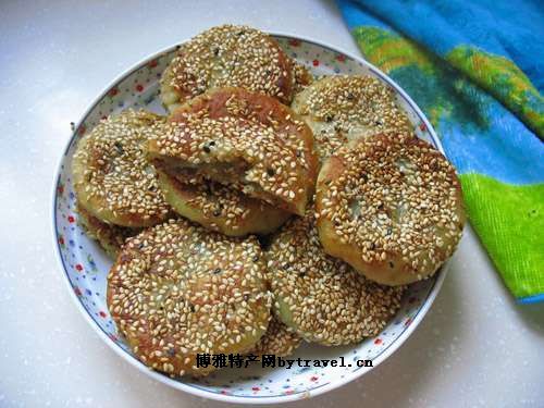 街子汤麻饼,又叫汤长发麻饼,是成都名小吃之一,原产地在崇州街子镇。正宗的汤麻饼是采用面粉、白糖、冰糖等原料,经制皮、制心、制油、制酥等程序后,制作成圆型,然后粘上脱皮芝麻,烘烤而成。其产品全部采用手工操作,纯绿色清真食品,无化工添加剂,保鲜时间可达半年以上。