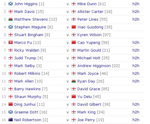 上海大师赛正赛举行时间为9月16日至22日,作为种子直接入围正赛的丁俊晖将在首轮对阵吉尔伯特,卫冕冠军希金斯[微博]的首轮对手是麦克-邓恩。(莫林)