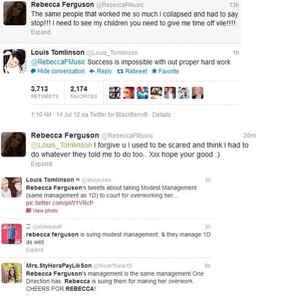 #8management操纵他们推特的证据。Rebecca(和男孩们一起参加x因素的人)在推上抱怨,没多久,louis这条推出现了,也许是management通过lou来挖苦她,Rebecca回了他,也许她发现那不是lou,于是原谅了他。长话短说吧,modest确实用男孩们的推特帐户发推,也许bullshit那条就不是真的