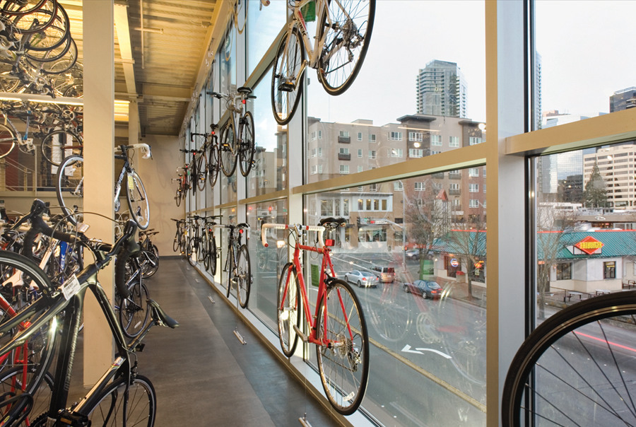 同普通自行车店相比,坐落在华盛顿的Gregg's Cycles就像《环太平洋》中的机甲一样庞大。Weinstein A|U设计的店面有12000平方英尺之大,除了悬挂在天花板的各色自行车,车店还有一个巨大的“橱窗”来展示自行车,想必从此经过的人们都会被如此壮观的场面震惊。