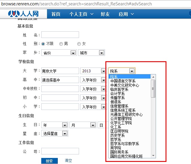 近期有新生反应,在注册人人网选择院系的时候,没有自己的院系。[黑线]