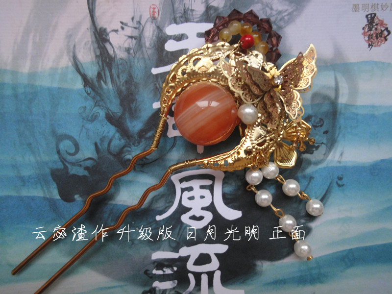 下面是第二弹,首先就是这个升级版的笑傲衍生日月光明,我误以为自己买到的珊瑚珠是20mm于是看到这个超萌的大玛瑙就毫不犹豫的爪了,拿到手才发现这个比珊瑚大了不止一圈,但素,我仍然很萌它,于是开始渣金色版。于是上面那个三层的蝴蝶,两年前没入坑的时候就买了,当时是想做个毛衣链,因为种种原因拖延至今它出现在了簪子上,虽然已经氧化了……
