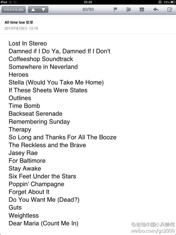新专的歌好多啊。。。Lost in stereo开场肯定能high起来。