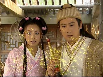本来这对欢喜冤家终于相爱,也成亲隐居,艳彩也发现怀上了韩湘子的孩子,可是,硬生生给分开了,艳彩化作韩湘子的法宝(类似短笛的东西),韩湘子打败龙王成仙了。