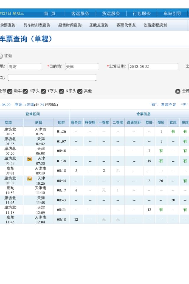 廊坊到天津的车很多,票很足,北京到天津的票也很多,也很足,详情咨询12306网上购票!