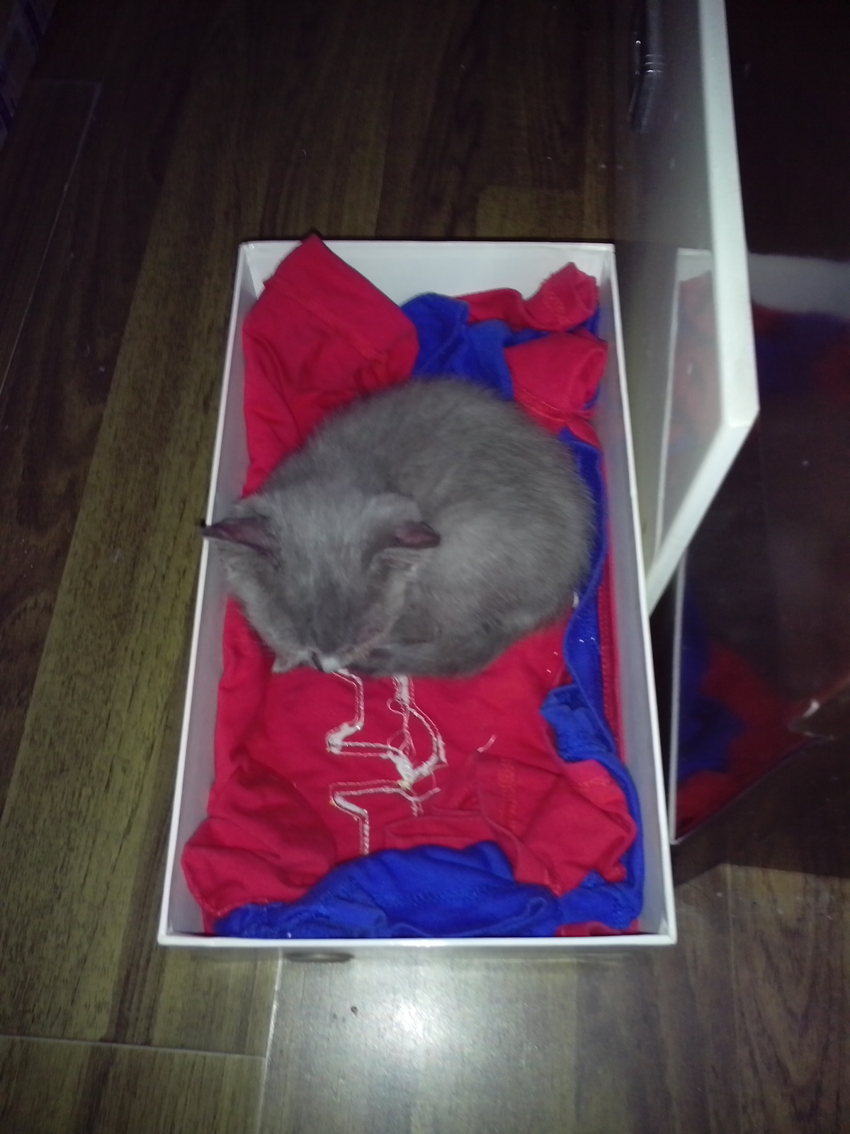 带小家伙回来是个特别仓促的决定,所以先用鞋盒铺了旧衣服做她的窝吧,可乐在里面沉沉的睡过去了。。。今天太折腾了,她累坏了