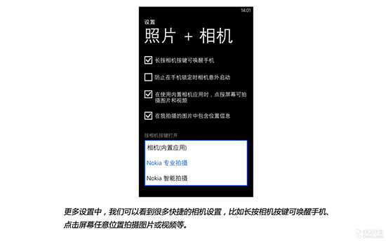 在设置菜单的更多设置中,我们可以看到很多快捷的相机设置,比如长按相机按键可唤醒手机、点击屏幕任意位置拍摄图片或视频等。另外,Lumia 1020还支持自定义相机按键功能,按下相机键分别可以设置为打开内置相机应用、NOKIA专业拍摄和NOKIA智能拍摄。