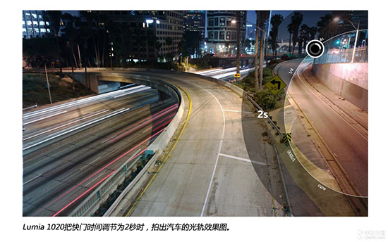 Lumia 1020把快门时间调节为2秒时,拍出汽车光轨效果图。