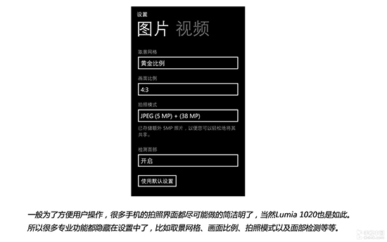 我们知道,一般为了方便用户操作,很多手机的拍照界面都尽可能做的简洁明了,当然Lumia 1020也是如此。所以很多专业功能都隐藏在设置中了,比如取景网格、画面比例、拍照模式以及面部检测等等。