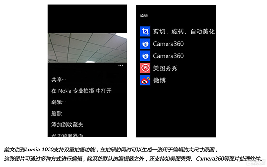 前文说到Lumia 1020支持双重拍摄功能,在拍照的同时可以生成一张用于编辑的大尺寸原图,这张图片可通过多种方式进行编辑,除系统默认的编辑器之外,还支持如美图秀秀、Camera360等图片处理软件。