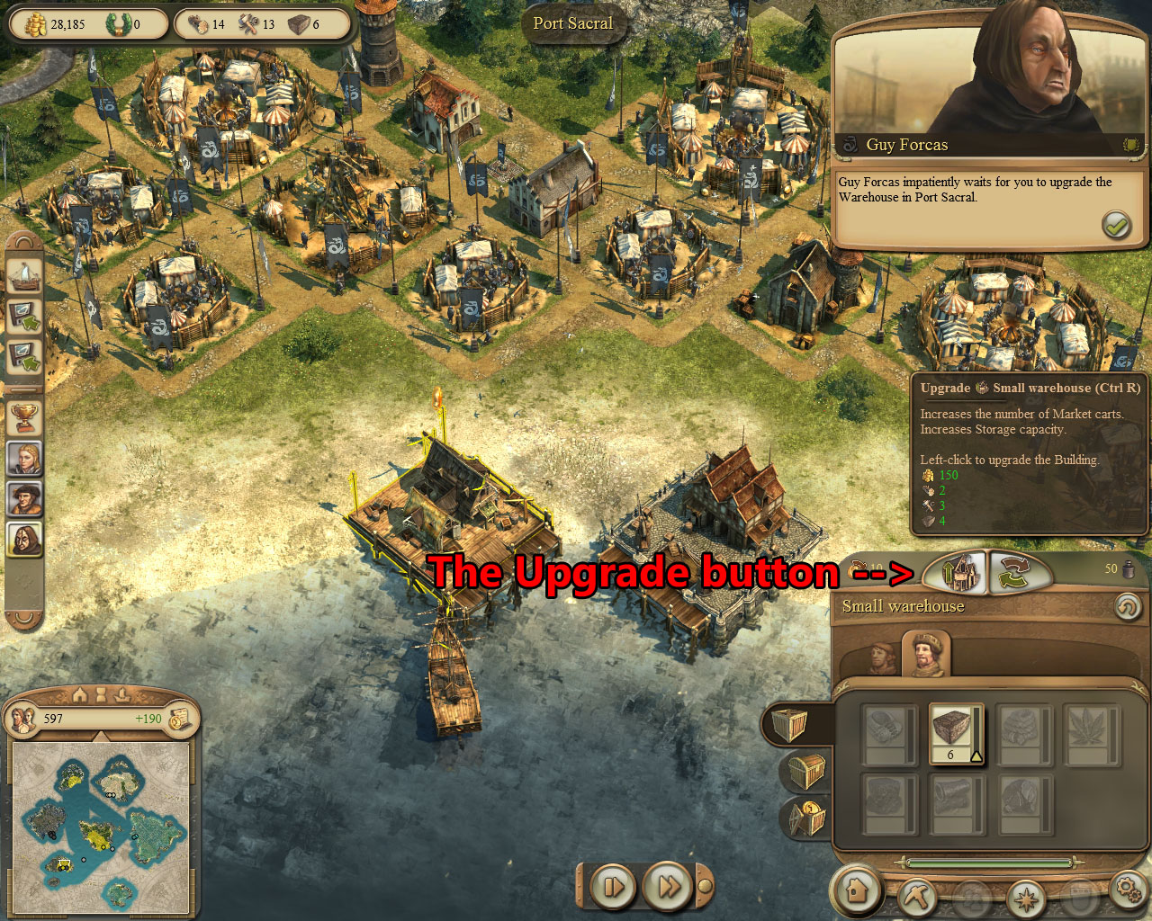 注意:这是你第一次遇到“找人”的任务。此任务比较简单,因为你现在的城市还特别小。然而之后遇到类似的任务,可能需要非常仔细地进行近距离寻找。一旦你找到了这些骑士,鼠标左击他们即可,你可以在港口仓库的强化室中见到他们。
