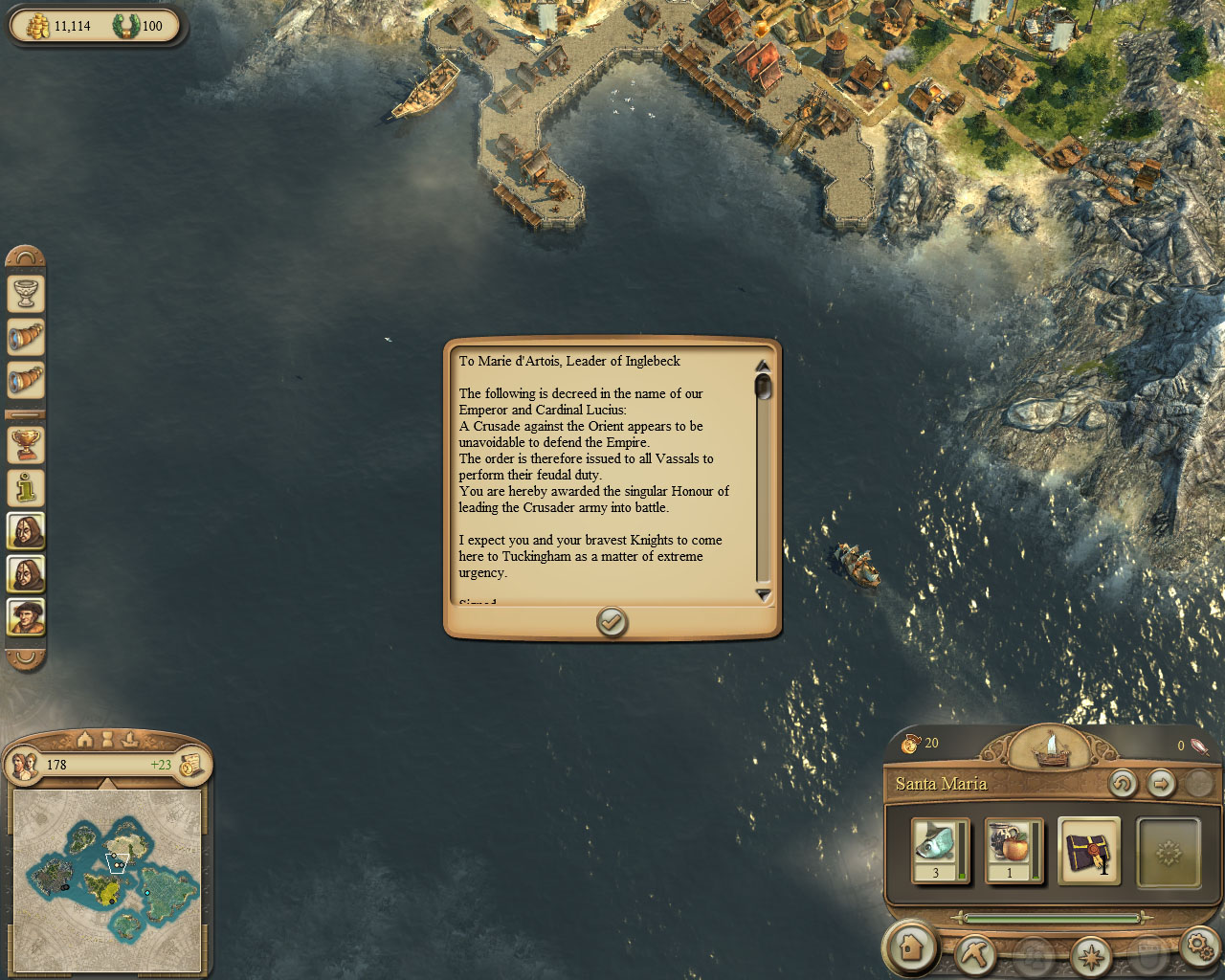 在送信的途中,诺老爷会叫你打开这封信。选取你的船只,鼠标左击这封信即可。