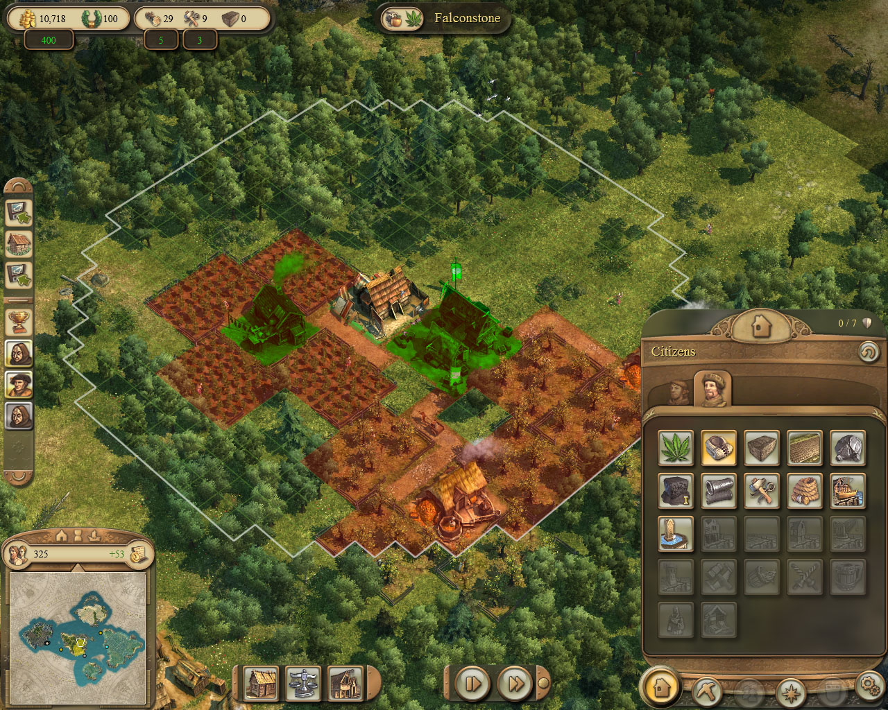 注意:发展到这个阶段,你的财政可能已经开始出现赤字。为了解决这个问题,你可以点击任意的民居,然后将税收从深绿色的区块调至浅绿色或黄色的区块