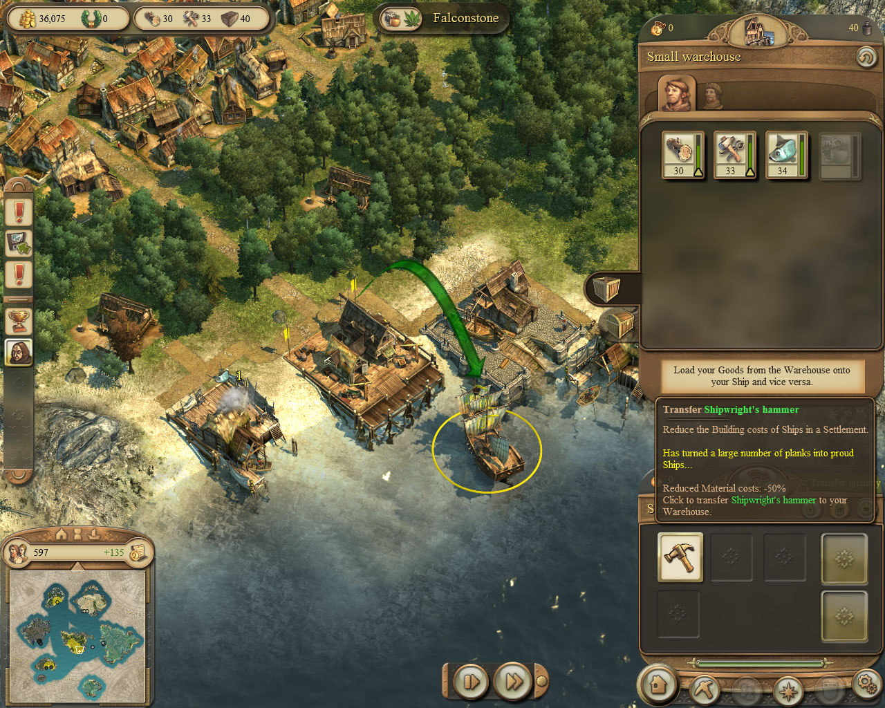 鼠标左击帝国大教堂的工地,诺老爷会请求你为他提供5吨石料。将石料运送至诺老爷的港口,他会回馈5吨绳索给你。这个任务是可以重复的,你可以通过这个途径获得额外的绳索,并建造更多的货船。
