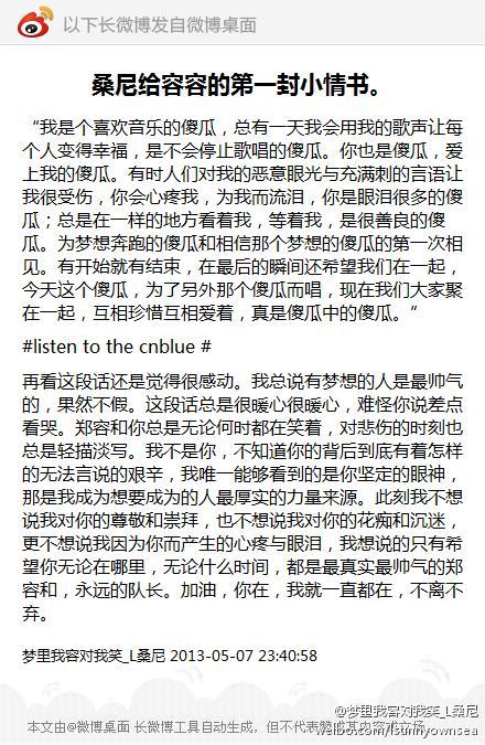 瞬间发现自己说了如此之多,絮絮叨叨讲述了过去与你共同组成的美好回忆。 尽管你在很远的地方语言也不通也许根本听不到我说这些话,也请原谅我私心想要记录下所有爱你的点滴,我太想将它留至未来细细斟酌回味,追溯这段时光的美好。 想要向你说明的心绪太多,想要赠与你的祝福太满,最后仍想对你说声谢谢,感谢你让我发生的每一个小小的变化,感谢你传达至我的满满的能量,感谢你的所有的一切填满我心里无解的那些空白。Anyway,you are the one who really saves me from the darkness,thank you all the while。 未来依旧未来,无法去预测什么,确信什么, 但唯一能够保证的就是: 亲爱的郑先森,我会一直陪着你走在你追梦的路上,看着你步上彩虹。 ——By L 、sunny 2013.06.22 我能为容和做的也只有这么多了。。。 希望我们的朴世洙能够再创佳绩。。。 加油啦。。 ==========================这贴封了=============================== 不管有没有人来看我都为容容做了我可以为他做的事 郑先森 加油咯~