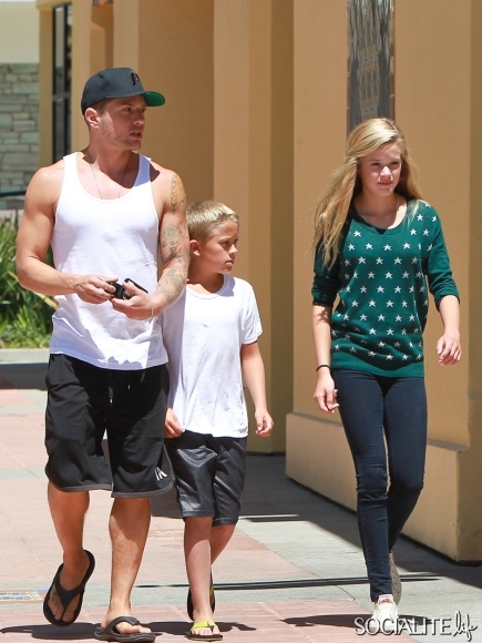 Ryan Phillippe showed off his guns while spending some time with his kids Ava and Deacon yesterday (August 25, 2013) in Los Angeles, CA. The trio enjoyed lunch together while their mother Reese Witherspoonstayed home taking care of baby Tennessee.