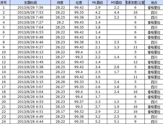 回复 三子M :云南省迪庆藏族自治州德钦县(525) 自动 101秒 2013-08-28 04:44:56.580 28.15 99.36 10 4.7(Mw) 云南省迪庆藏族自治州德钦县(53) 自动 90秒 2013-08-28 05:38:56.470 28.09 99.25 10 3.3(ML) 云南省迪庆藏族自治州德钦县(288) 自动 75秒 2013-08-28 07:53:09.680 28.17 99.30 10 4.0(ML)