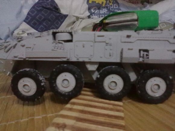 改完试车发现车太轻,转向基本没有,加了配重好了点。还是不行。没法只好给轮子上了一层胶增大摩擦力!还是差点劲。而且发现往右边倒车的时候转向不行。最后发现驱动靠近右后轮,估计轮子上胶阻力大了,看样子要加差速器了不知道是不是这个原因!下次改的时候加个差速试试