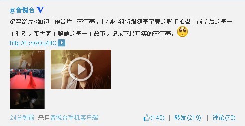纪实影片<如初> 预告片 - 李宇春,摄制小组将跟随李宇春的脚步拍摄台前幕后的每一个时刻,带大家了解她的每一个故事,记录下最真实的李宇春。http://t.cn/zQu4ltQ