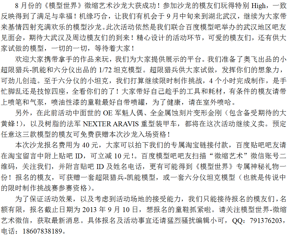 《模型世界》微缩艺术沙龙武汉站暨百度模型吧武汉模友见面会!