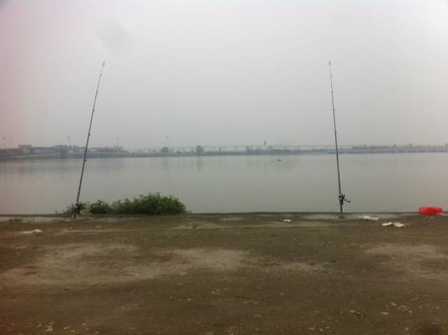 哈哈。早上看别人去学校上课,我在这边钓鱼。保佑我钓到鱼吧!!