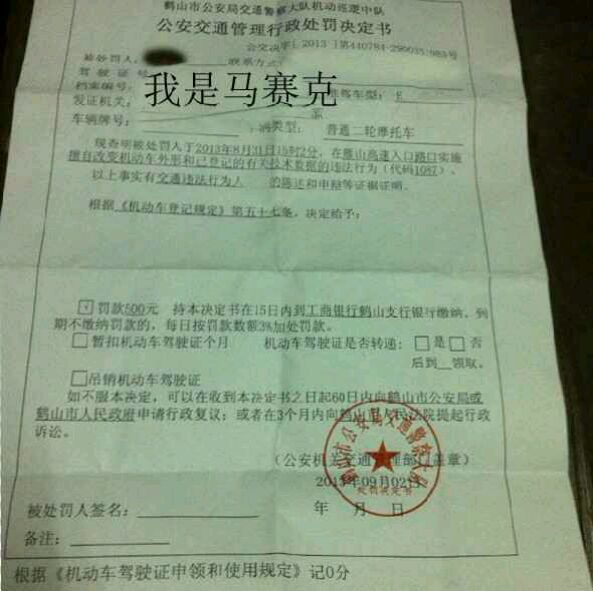 回复@阿涛945 :你真够冤,当时就别签字,哪有摩托车罚500的。