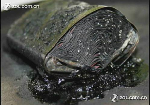 实验二:国产诺基亚兼容电池------即飞毛腿,弘毅,MOMAX等品牌电 爆炸温度: 191摄氏度。 爆炸现象: 电池先膨胀,之后伴随着向上的火星爆炸,碎片四处飞溅。 爆炸威力:4颗星 碎片:小块,焦黑