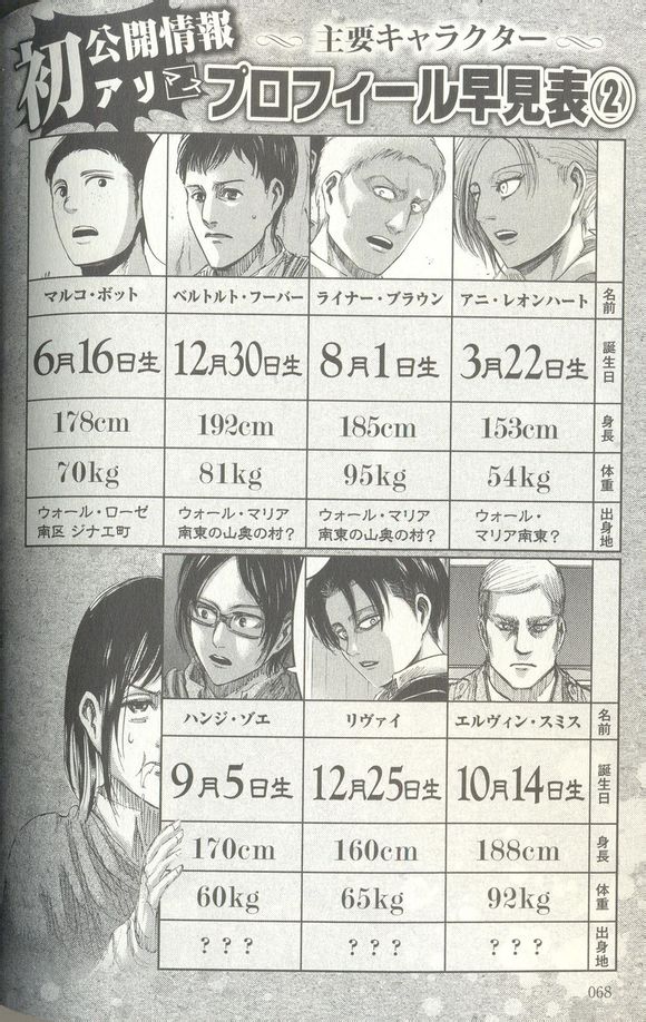 公式书2看到了众人的身高体重,脑海里不禁浮现了成串的问题:三爷的体重是不是太重了啊?女性中身材最好的是谁啊?哪个男的跟兵长的体质相似呢?等等。。。。。