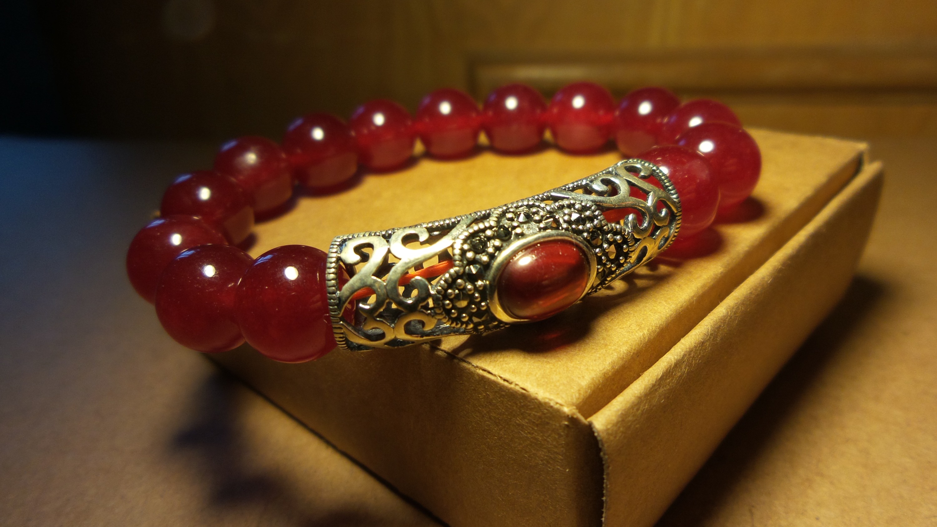 后夏 原创红玉髓原色玛瑙搭配石榴石泰银三圈手链