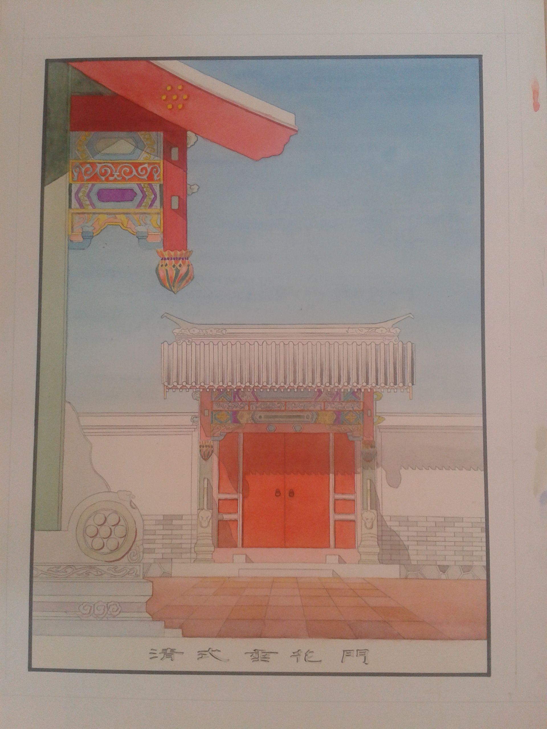 对清式色彩要有理解。首先红色不对。清式的朱红是类似巴比伦骨螺的偏紫色红,不会有太明亮的感觉,阴影下更是发黑。垂花门水磨石是清灰色不是绿色,绿色是毛石或花岗岩,很少做门头。青砖的颜色需要沉下去很多。总体说,如果想要在我手上打优加,需要重画,如果想打优减,还有一倍工作量I