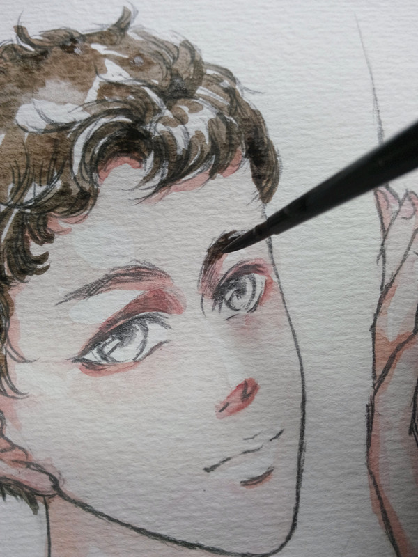 再是头发~~这里用的是褐色的~先涂背光面~~亮部先留出来~~I