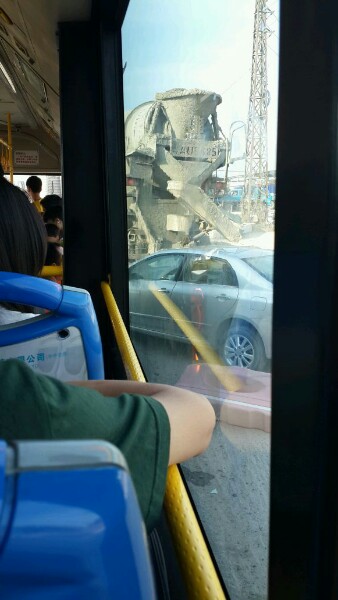 呀的前面水泥车后面吧士。这呀的小皇冠硬是要从两车中间过神。中国技术就怎么牛。
