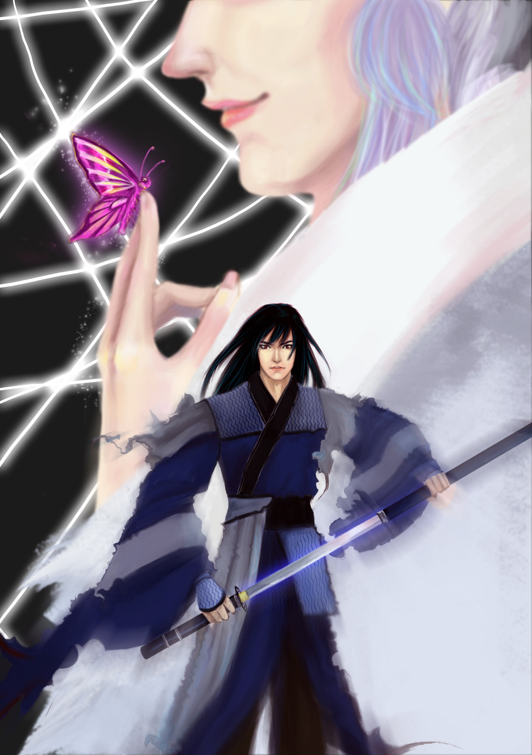画得不差~尤其是蛛网背景,很带感啊,配上楼主的这个笑容(上扬的嘴角略邪恶),指尖上的蝴蝶,拔剑的剑四毛,完全一副老丈人考验女婿的情势。