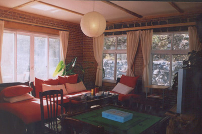小溪潺潺地流着,晚上住在这里的人们也会伴着这动听地水声入眠,她不会让人觉得吵,如同天籁之音。来到山吧的大堂前台的台面是一块光滑的木头,大厅里的座椅和茶几全是藤编的,很天然的感觉。墙也是红砖的本色,上面挂着几幅简单的小画、质朴的挂毯和一些干花,觉得很雅致。