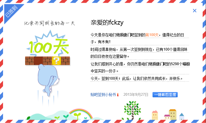 在本吧已累计签到100天了,截图留念一下下
