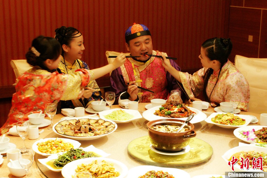 “十一”黄金周期间,湖南怀化洪江古商城景区借旅游文化周别出心裁推出了“少爷待客菜”、“小姐养生菜”、“老爷私房菜”等菜肴。这些菜肴一亮相,立刻引来众多游客围观、或品尝,其名称与文化内涵也相继引发坊间争议。图为一位男性游客正在品尝“少爷待客菜”。徐秉洪 摄