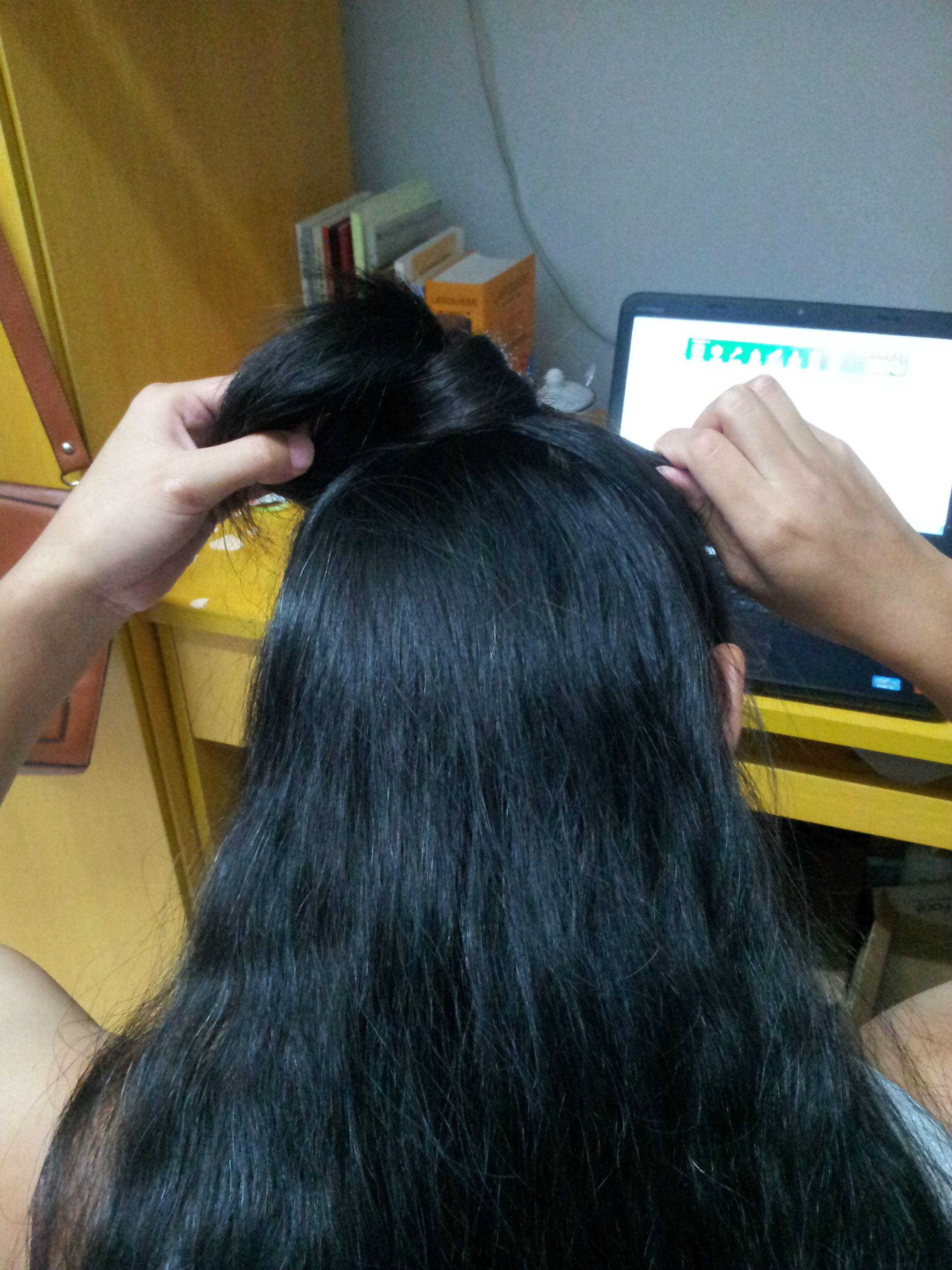 头发分上下两个区,上面的可以比下面的多一点。扎一个小揪揪,不要太小