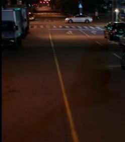 影子在路面上,摄像师坐在摇壁上用摄像机拍摄时的影子