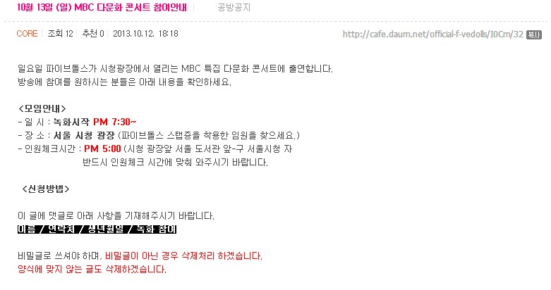 일요일 파이브돌스가 시청광장에서 열리는 MBC 특집 다문화 콘서트에 출연합니다.