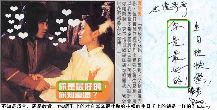 1.拍再生时叶璇给林峰写过一张卡片,称呼是少华,后面写着“再生缘,与尔共赏,风光无限,墨和念,请君玩。”然后写了生日快乐之类的,落款是丽君。