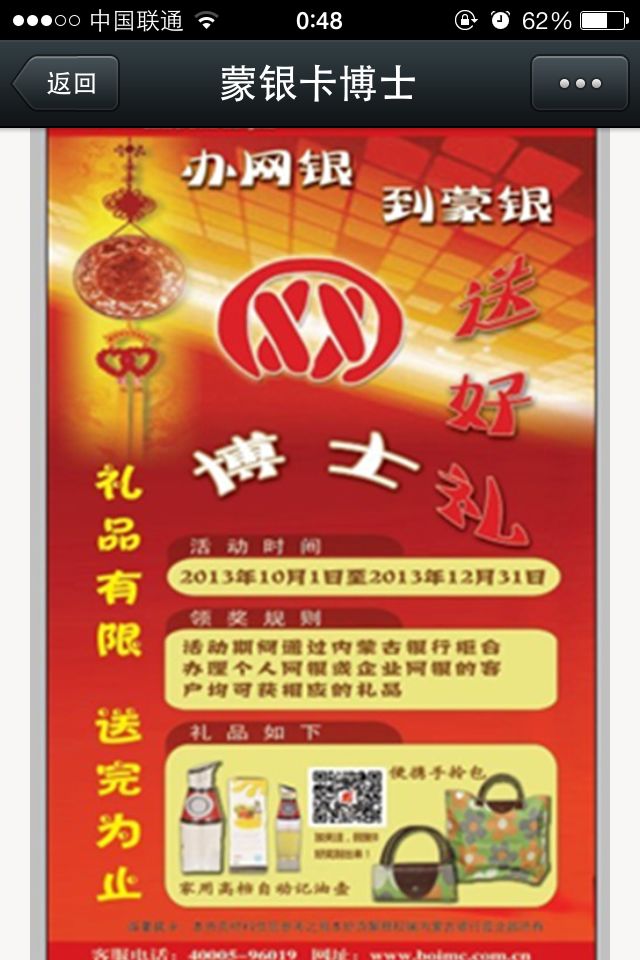 参与方式:凡活动期间开通个人或者企业网银的客户关注微信公众账号“蒙银卡博士”,回复数字"8"参加幸运百宝箱抽奖活动。