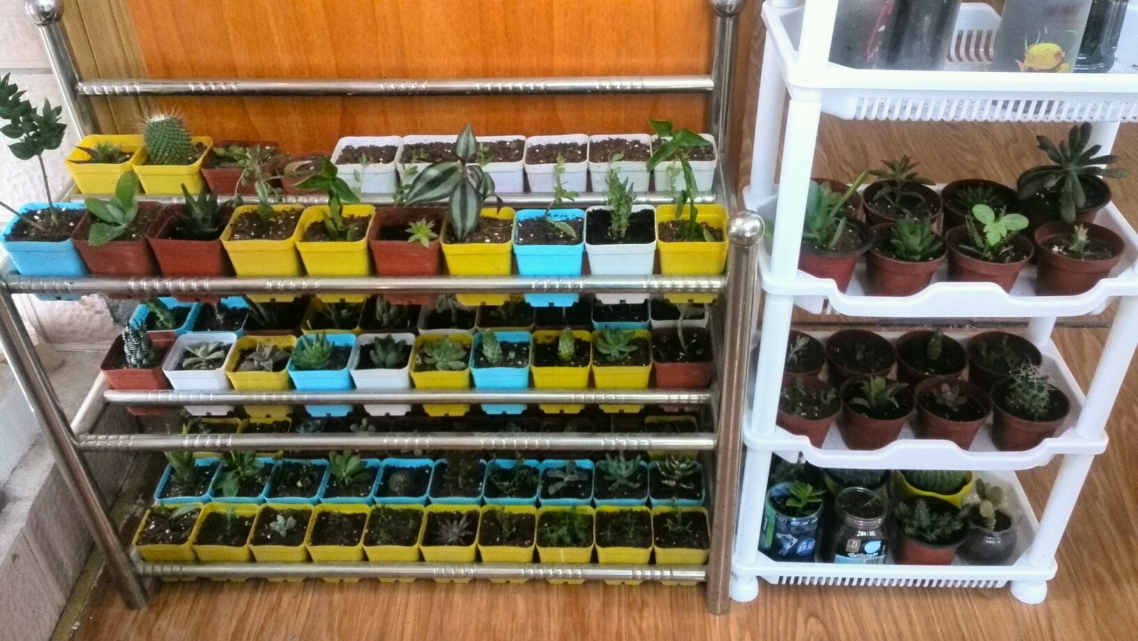 废弃的鞋架子,小方盆正好卡进去,省了不少空间呢,买花架的钱可以省下买好多肉肉了