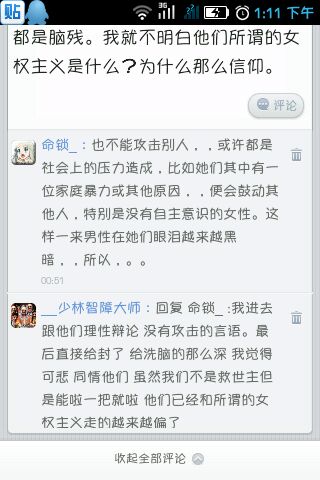 回复 叶落旋转 :你去女权吧看看就知道了,,全是无理取闹的。帖子,,刚刚看到一贴,名字:有人问我生孩子怎么教育,,戳,,我服了他了。如果发帖反驳,毫无疑问你会被禁封