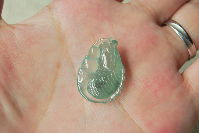 【描述】-可爱鲤鱼一枚,绿水底色,料子细腻,雕刻栩栩如生,活灵活现,有点细纹,无纹裂!