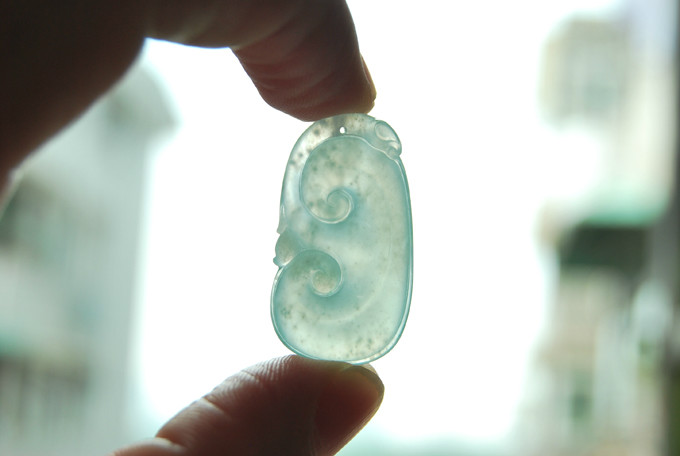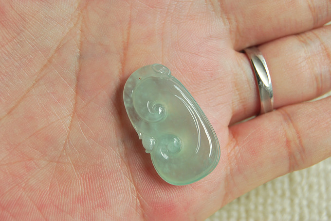 【描述】-高冰种,实物淡淡的晴底,种老,起荧,玉质清透,微棉,水亮水亮的,雕工漂亮,喜庆十足,实物更漂亮。无纹裂。