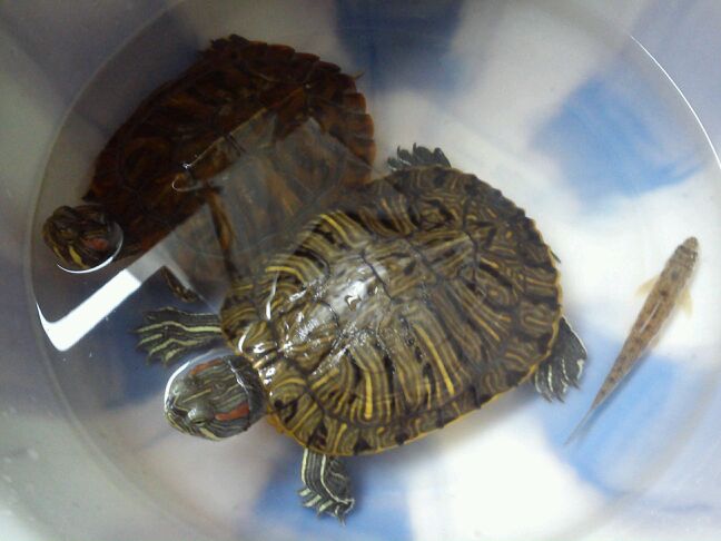 大的个开始脚上有伤,过两天自己好了,!爸爸是钓回来用盐喂两天,消毒,然后就这么喂。它自己就吃了,很听话