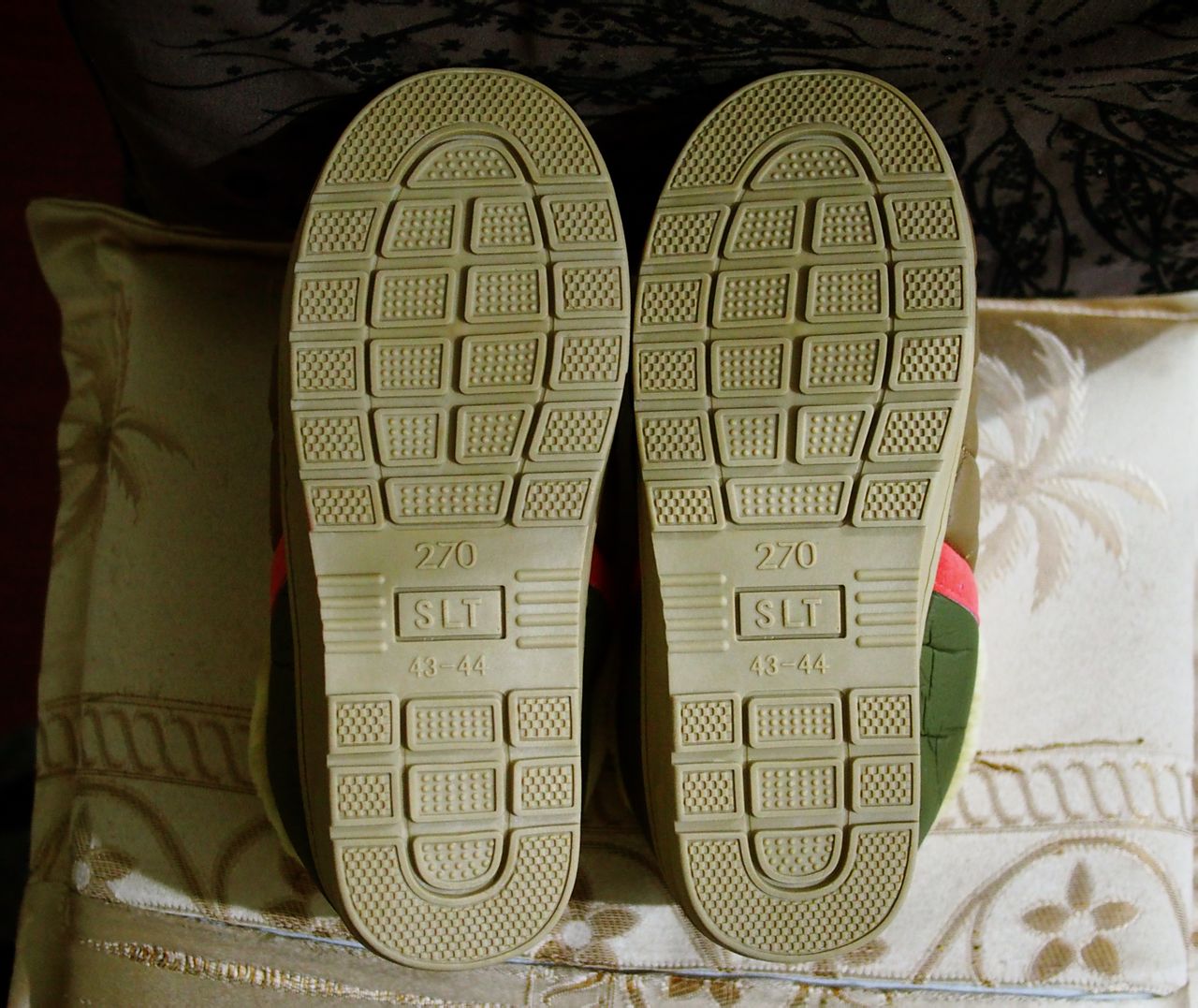 最后,是在网上买的家居棉拖鞋,穿上以后就感觉别扭,翻过来仔细一看,我无语了。。。