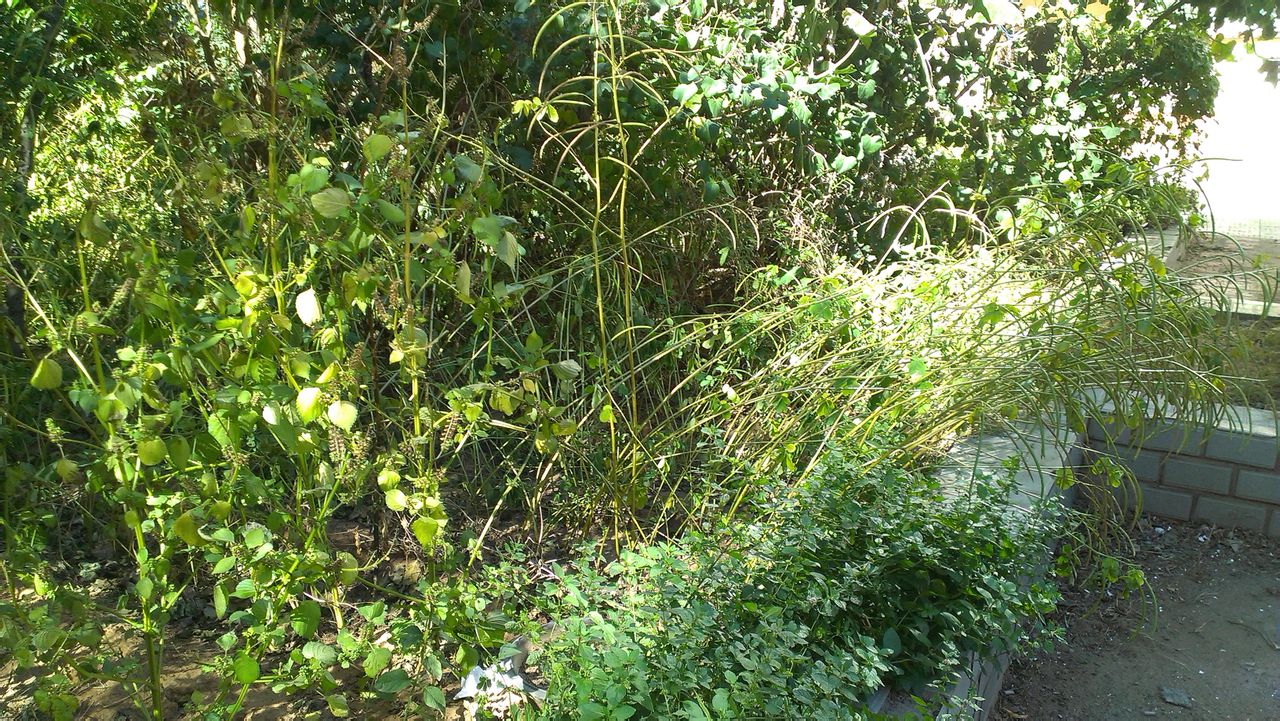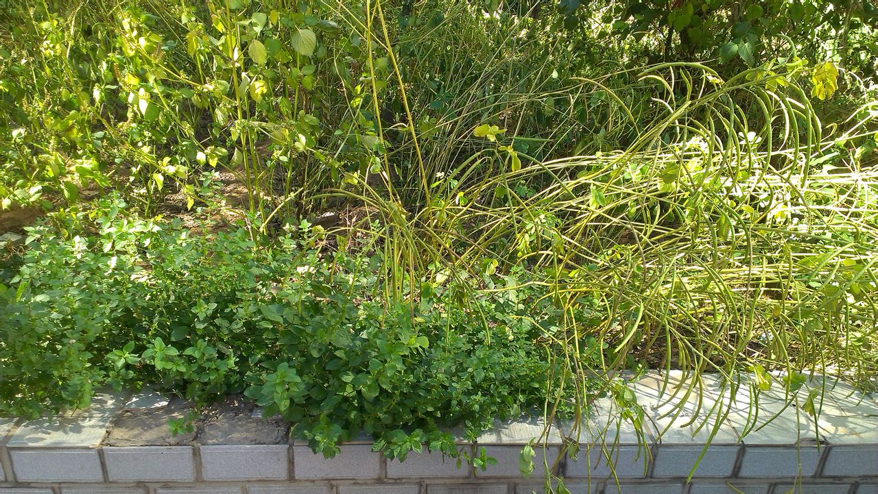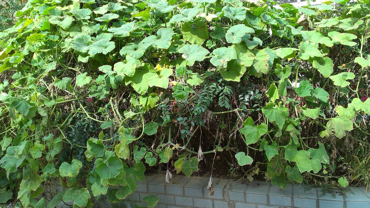 盛夏时节:勤劳的人们在花坛里种上的各种作物,异常茂盛。