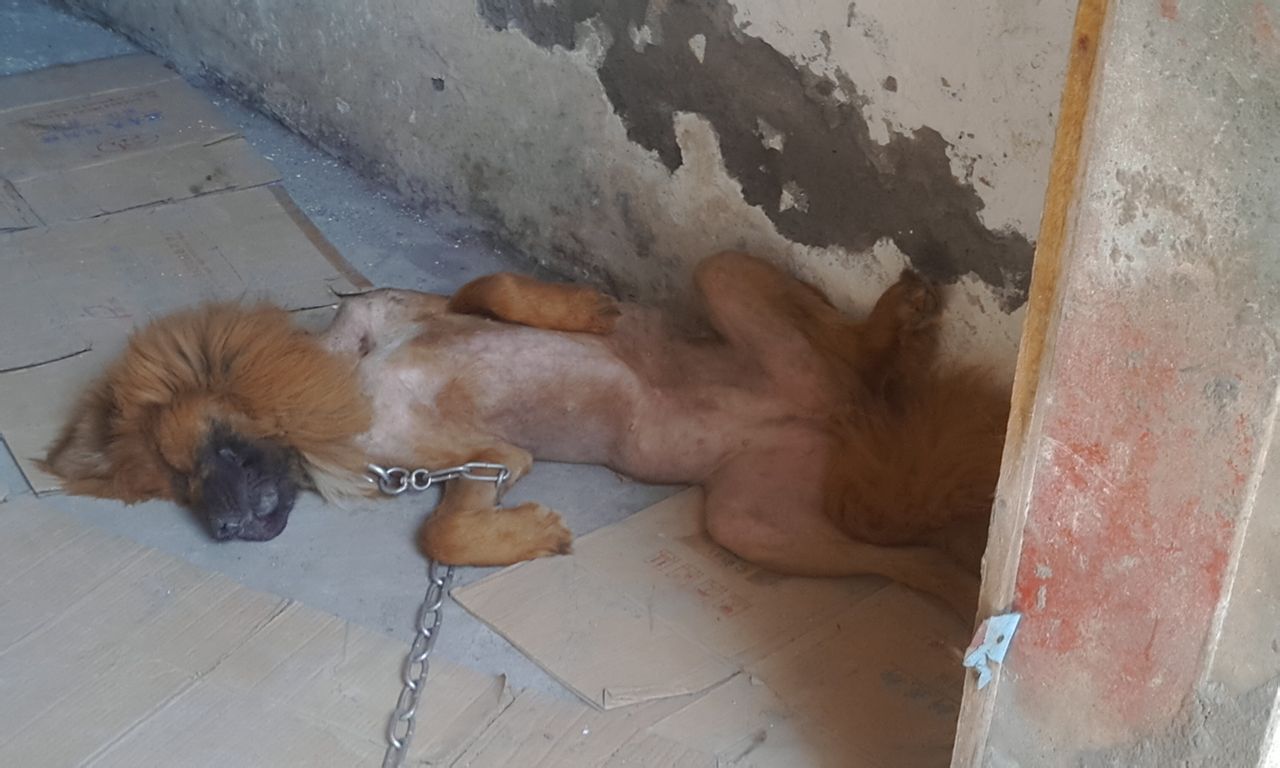 因为以前没有养过藏獒的经验(养过德牧,狼犬,罗威纳),傻乎乎的给她洗了个冷水澡,没有吹干,几天以后才发现里面的绒毛还没有干,开始长螨虫了。看她又痒又热的样子,果断给剃了光光。