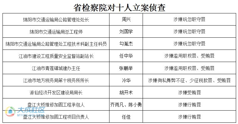 记者30日从最高人民检察院获悉,由最高检挂牌督办的四川省江油市盘江大桥垮塌事故案中,包括7名官员在内的10人涉嫌滥用职权、玩忽职守、受贿和行贿犯罪被检察机关立案侦查。